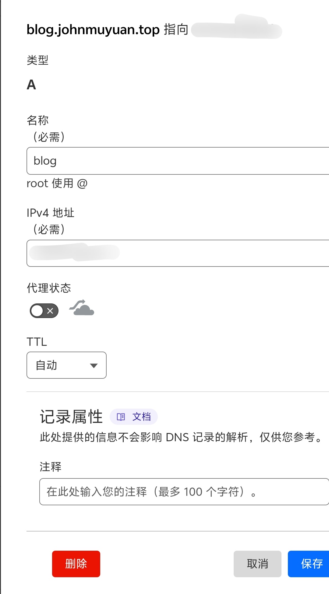 前往cloudflare官网注册账号并托管你的域名(碍于不是很难我就不教了),创建一个DNS记录(点击你的域名后,点左上角的三条杠打开侧菜单,点击DNS,就可以看到了),类型选择A就行,名称就是域名前的内容,若输入blog,那么你的网站域名就成了blog.xxx.xx,好理解吧。如图所示配置即可。