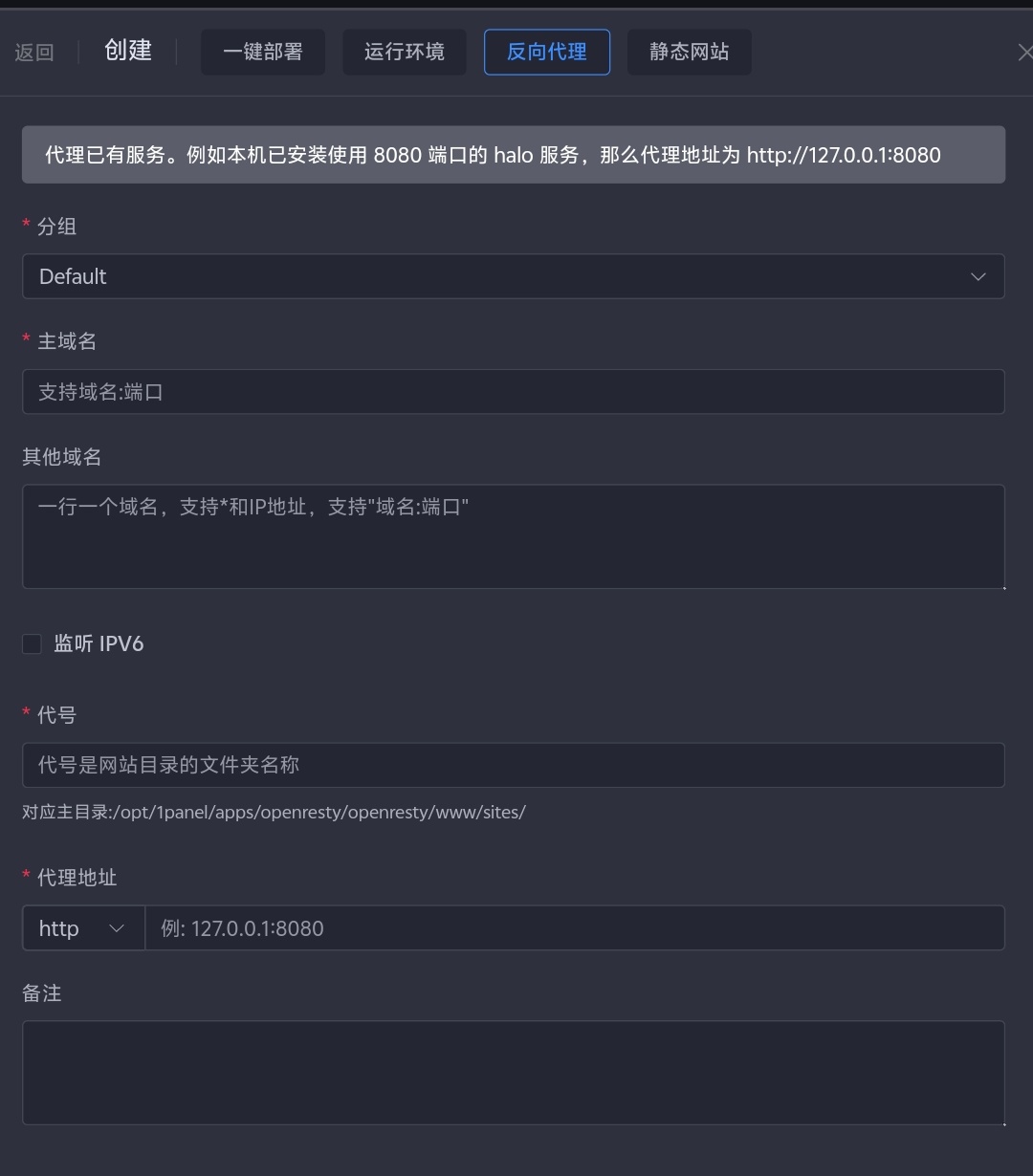 接下来回到1panel,打开侧菜单,点击网站,选择创建网站,点击反向代理,如图所示:
