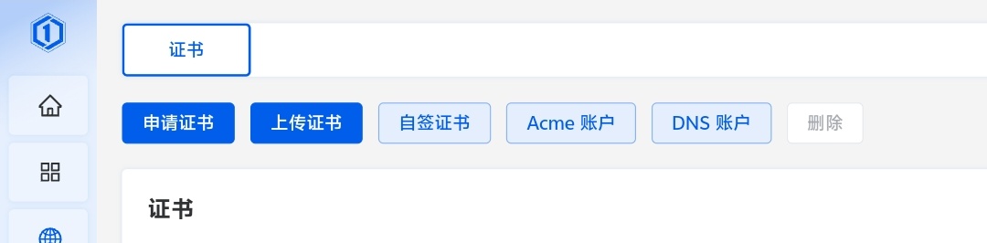 在等待期间,我们可以先搞定证书的部分,网站下面就是证书栏,打开后我们会看到上面有五个按钮。