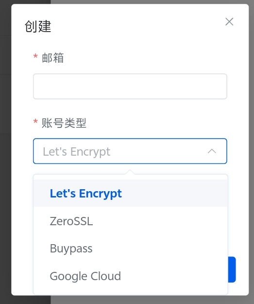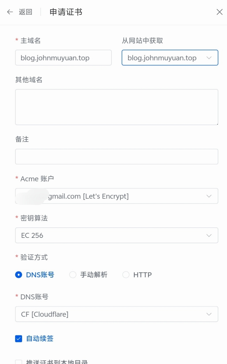 在“从网站中获取”那一栏选择你刚刚添加的网站,选择好你创建的Acme账户和DNS账号,密钥算法要选择你Acme账户创建时选择的算法。如图所示。
