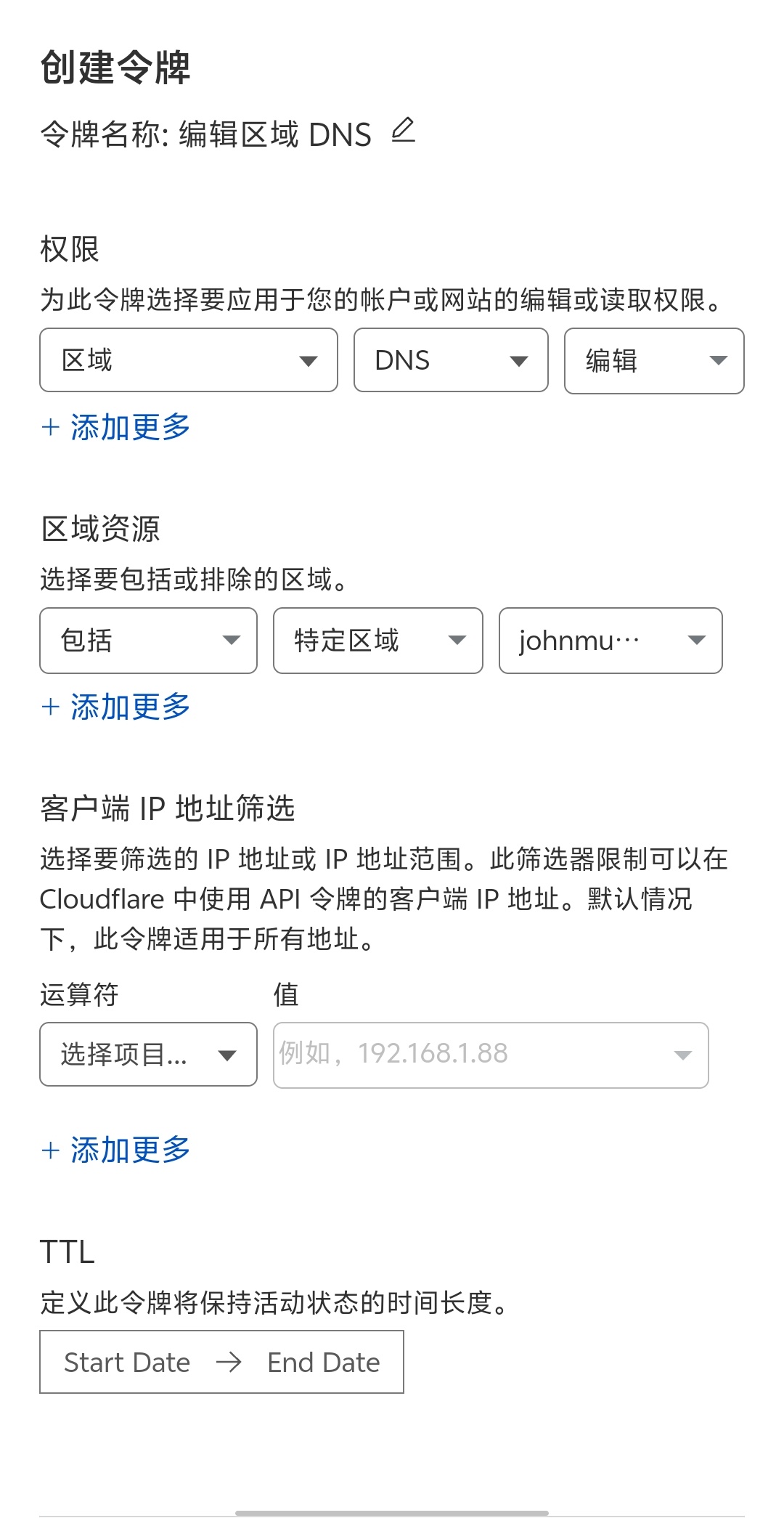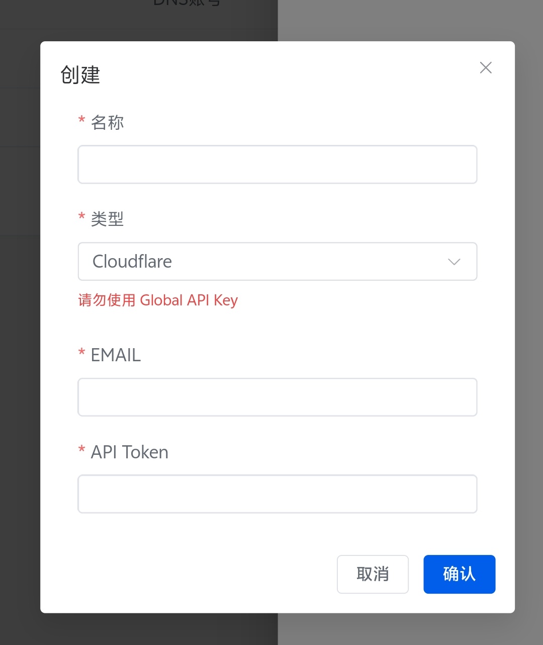 其中类型我们要选择Cloudflare,名称任意,你自己知道就好,Email输入cloudflare绑定的email,API Token我们要去cloudflare创建并获取。