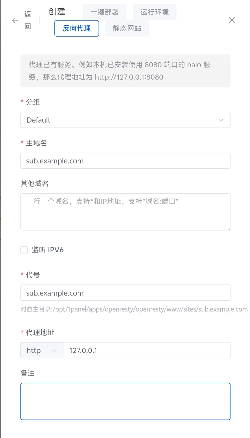 在主域名那一栏,输入你在cloudflare里创建的DNS记录的域名(图中示例为sub.example.com),然后代理地址要填写 127.0.0.1:端口(端口以安装substore脚本的上的为准,你要是没有更改那么就是3001),只需要更改这两个,其他的默认即可,往下点击确认。