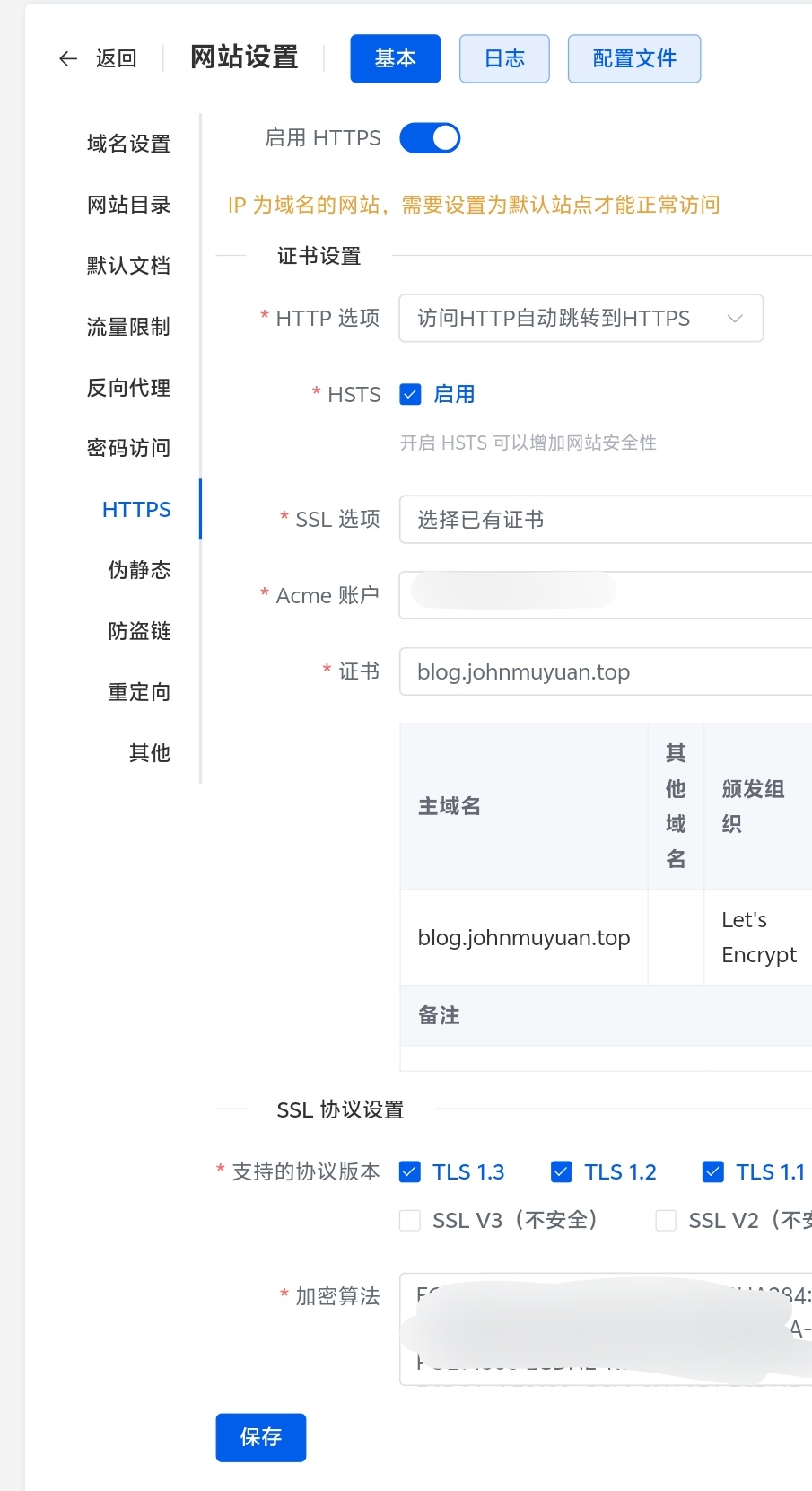选择HTTPS,在右边最上面打开 启动HTTPS,然后SSL选项选择选择已有证书,Acme账户选择你创建证书的账户,然后下面那栏证书选择你的网站的证书,其他不变,点击保存。