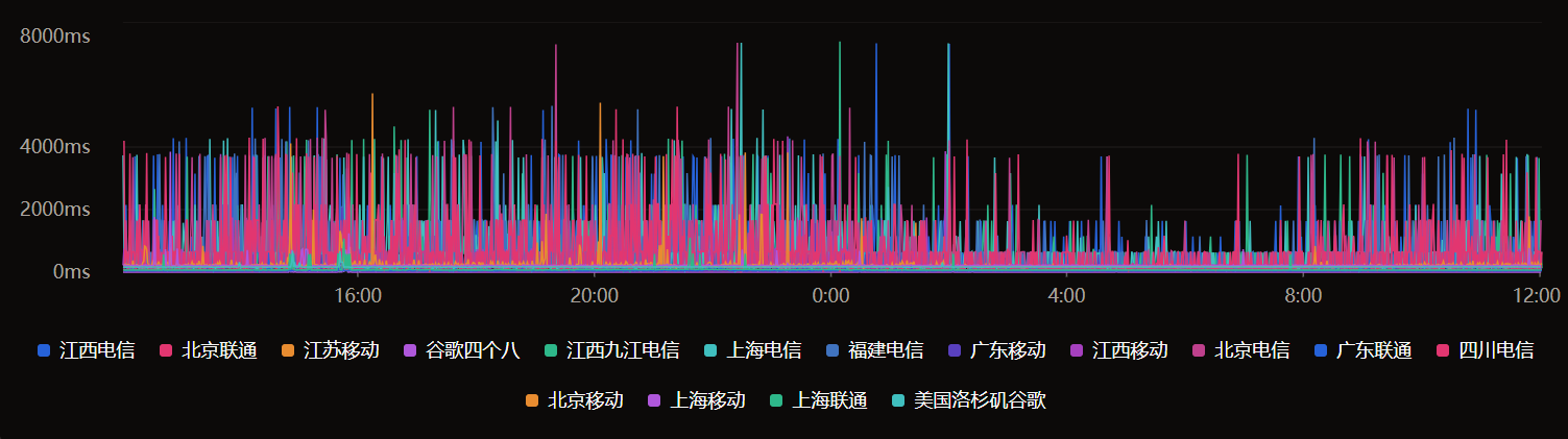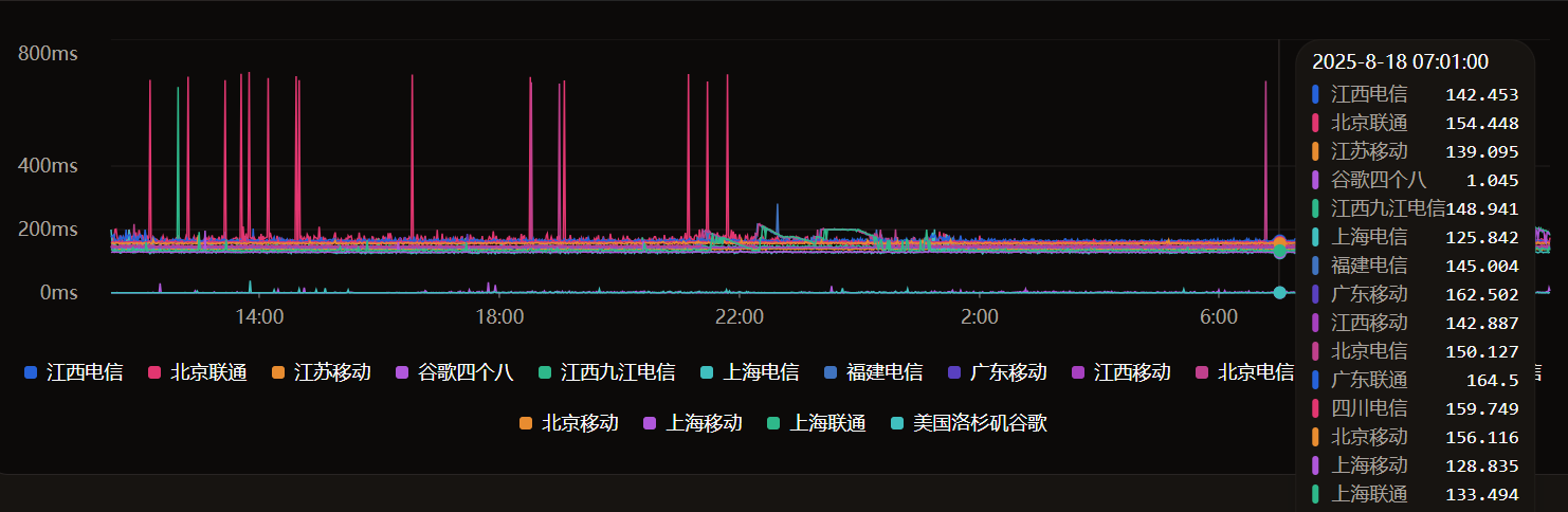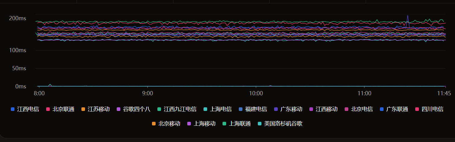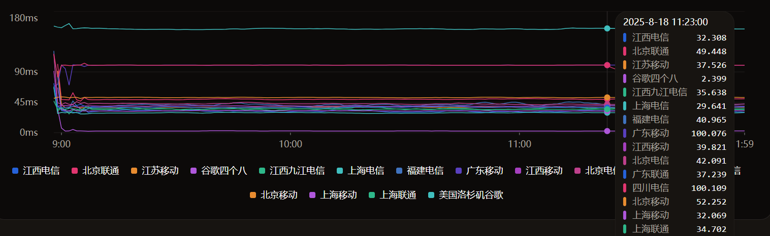 可以看到,这台机子的三网直连延迟几乎都是一条直线,偶尔的波动是允许的,毕竟这台机子好像没有上专线?