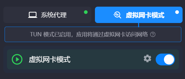 务必开启代理软件里面的虚拟网卡模式,也就是TUN模式。